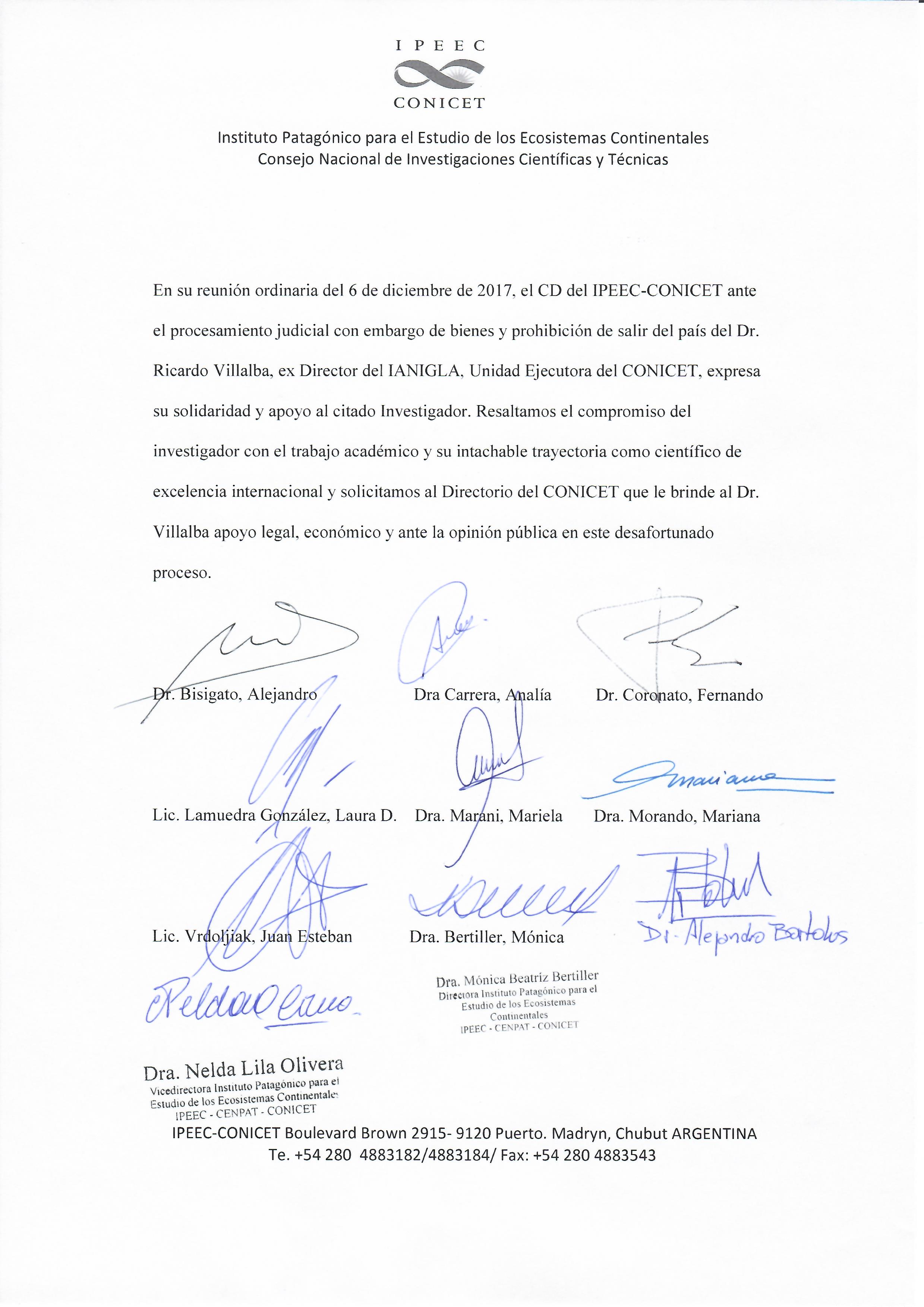 Carta de Apoyo público al Dr. Ricardo Villalba, Investigadores Autoconvocados 2017