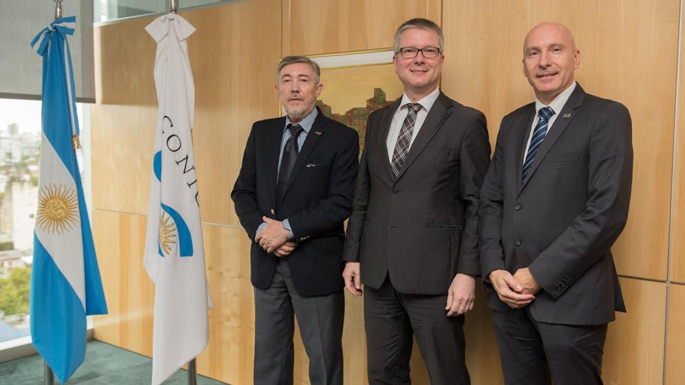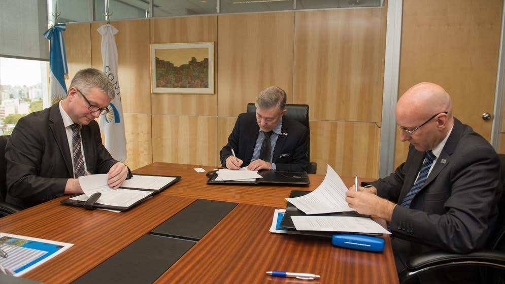 En un acto realizado en la Sala de Presidencia del Consejo Nacional de Investigaciones Científicas y Técnicas (CONICET), su presidente, el doctor Alejandro Ceccatto junto al presidente del Instituto Geográfico Nacional (IGN), el agrimensor Sergio Cimbaro y el titular de la Agencia Federal de Cartografía y Geodesia de la República Federal Alemana (BKG, por su sigla en alemán), el doctor Hansjörg Kutterer, firmaron un acuerdo que establece un programa técnico y científico conjunto para el uso de información producida por el Observatorio Argentino – Alemán de Geodesia (AGGO) para mejorar y mantener los marcos de referencia geodésicos y el desarrollo de productos que sean útiles para la comunidad geodésica internacional y ciencias afines.