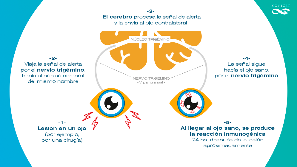 En un trabajo publicado en la prestigiosa revista Mucosal Immunology, del Grupo Nature, científicos del CONICET hallaron el porqué de esta reacción cruzada: la lesión de un ojo ‘viaja’ como una señal de alarma hacia el sistema nervioso central y de allí al ojo sano, en un mecanismo neurogénico que incluye a la sustancia P y al receptor TRPV1.