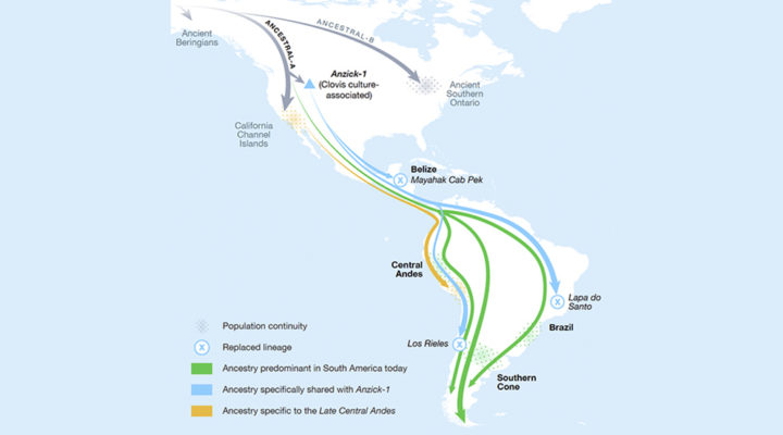 Los primeros datos de ADN nuclear antiguo* de alta calidad obtenidos de 49 individuos provenientes de distintos sitios de América Central y del Sur, algunos de ellos con una antigüedad de 11.000 años, muestran aspectos novedosos de la dinámica del poblamiento Americano. El estudio muestra que un tipo de ADN distintivo asociado con la cultura arqueológica de América del Norte denominada Clovis, también se detectó en Chile, Brasil y Belice, en individuos datados entre 11.000 y 9.000 años atrás. Esto sugiere que las poblaciones que difundieron la cultura Clovis también tuvieron un impacto demográfico en América del Sur. Sin embargo, este linaje asociado con Clovis, no está presente en las poblaciones sudamericanas posteriores. Esto indica un reemplazo de la población en el continente que comenzó hace al menos 9.000 años. Estos resultados han sido publicados en un estudio reciente en la revista Cell en donde se presentan detalles novedosos sobre el poblamiento de América Central y del Sur. El estudio ha sido dirigido por investigadores de la Escuela de Medicina de Harvard, el Instituto Médico Howard Hughes, el Instituto Max Planck de Ciencias de la Historia Humana, la Universidad de California en Santa Cruz, la Universidad Estatal de Pennsylvania y otras instituciones en Argentina, México, Brasil, Belice, Chile, Perú, la Unión Europea y los Estados Unidos. De Argentina participaron en este estudio cinco investigadores del CONICET, los Dres. Pablo Messineo (INCUAPA-CONICET y UNICEN), Clara Scabuzzo (CONICET), Nahuel A. Scheifler (INCUAPA-CONICET y UNICEN), Daniel Corach (SHDG-FFyB-UBA) y Gustavo Politis (INCUAPA-CONICET, UNICEN y UNLP).