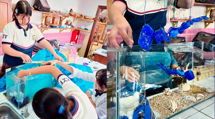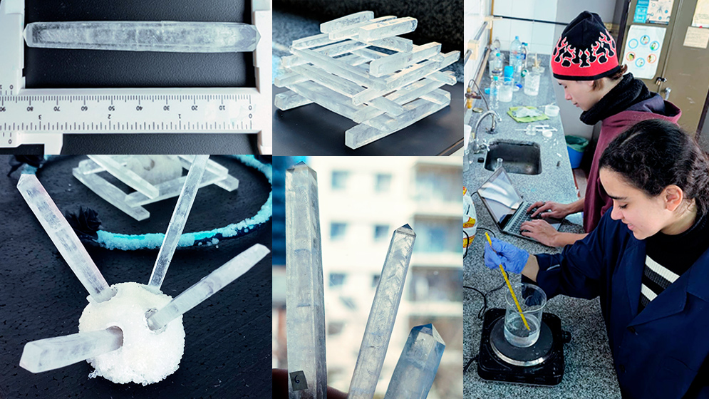 El colegio de Salta utilizó como temática la expedición científica del CONICET al fondo marino (realizada en julio de 2025), formando una “ballena de cristales” de la sustancia química sulfato de cobre, que tiene naturalmente un color azul muy llamativo. En el trabajo combinaron rigor científico, arte y creatividad. Mientras que el colegio de Caballito se focalizó en la optimización del crecimiento de un tipo especial de cristales llamados “monocristales” o cristales únicos. Utilizaron la sustancia química fosfato diácido de potasio que forma unas barras cristalinas transparentes de una belleza especial. Los alumnos armaron dispositivos para controlar con extremo cuidado todas las variables experimentales (evaporación, temperatura, etc).