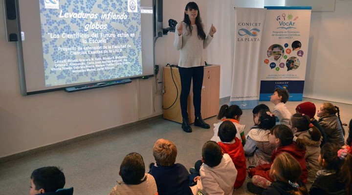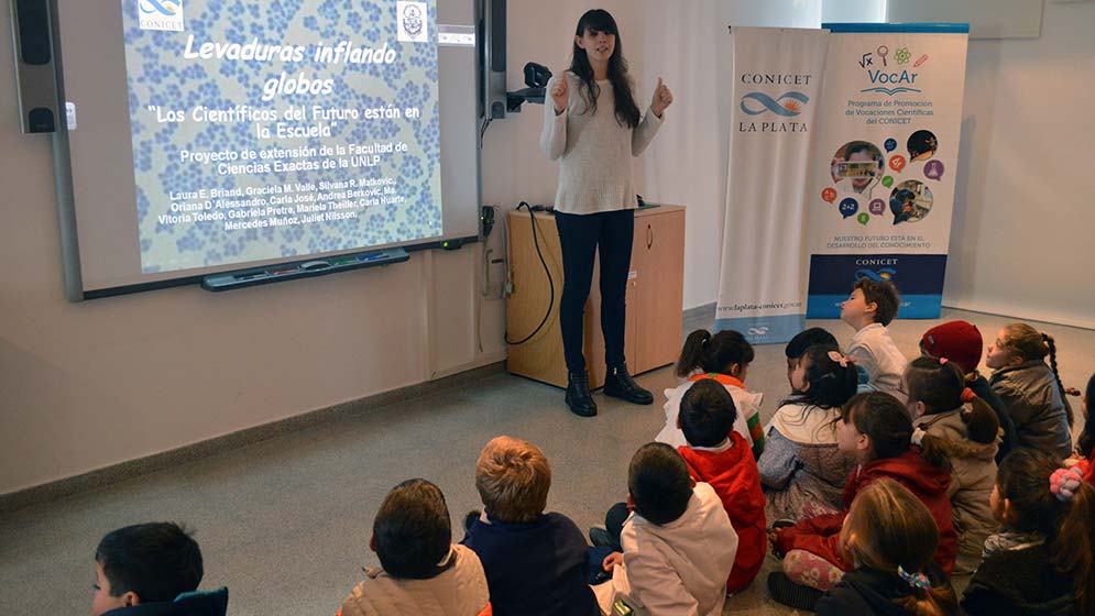 Fue en ese marco que investigadores del Centro de Investigación y Desarrollo en Ciencias Aplicadas (CINDECA, CONICET – UNLP) brindaron distintas actividades de química con activa participación de los niños. Entre otras cosas, valiéndose del gas generado por la mezcla de levadura, azúcar y agua tibia los futuros científicos inflaron globos, en una acción que les permitió entender el proceso de fermentación del pan.