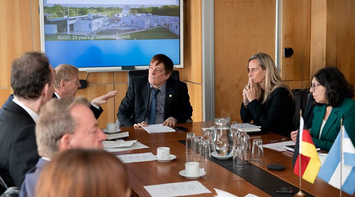 Los presidentes del Consejo Nacional de Investigaciones Científicas y Técnicas (CONICET) y de la Agencia Federal de Cartografía y Geodesia de Alemania (BKG, por sus siglas en alemán), Daniel Salamone y Paul Becker respectivamente, firmaron un convenio de cooperación científica para la construcción de una nueva antena con tecnología VLBI Global Observing System (VGOS). Ambas instituciones actualmente congestionan las actividades del Observatorio Argentino-Alemán de Geodesia (AGGO, CONICET-BKG) y este nuevo radiotelescopio reforzará la modernización del AGGO de acuerdo a las necesidades técnicas, científicas y tecnológicas y contribuirá al Sistema de Observación Geodésica Mundial (GGOS). El encuentro contó con la presencia del embajador de Alemania en Argentina, Dieter Lamlé.