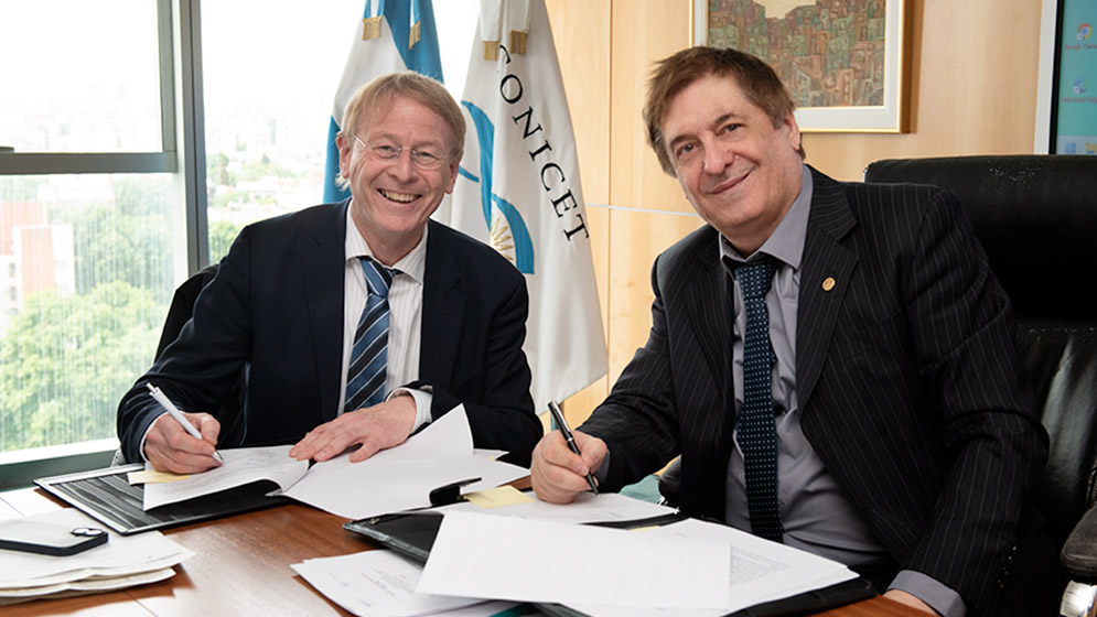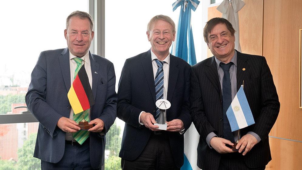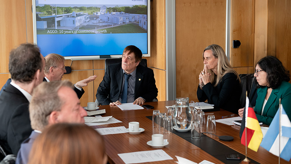 Los presidentes del Consejo Nacional de Investigaciones Científicas y Técnicas (CONICET) y de la Agencia Federal de Cartografía y Geodesia de Alemania (BKG, por sus siglas en alemán), Daniel Salamone y Paul Becker respectivamente, firmaron un convenio de cooperación científica para la construcción de una nueva antena con tecnología VLBI Global Observing System (VGOS). Ambas instituciones actualmente congestionan las actividades del Observatorio Argentino-Alemán de Geodesia (AGGO, CONICET-BKG) y este nuevo radiotelescopio reforzará la modernización del AGGO de acuerdo a las necesidades técnicas, científicas y tecnológicas y contribuirá al Sistema de Observación Geodésica Mundial (GGOS). El encuentro contó con la presencia del embajador de Alemania en Argentina, Dieter Lamlé.