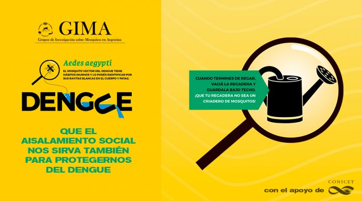 Bajo el lema “Que el aislamiento social nos sirva también para protegernos del dengue”, un grupo de investigadores del CONICET y de distintas universidades nacionales, nucleados bajo el nombre de Grupos de Investigación sobre Mosquitos en Argentina (GIMA), lanzaron una campaña de concientización que busca instar a los ciudadanos a aprovechar la cuarentena —medida de aislamiento social preventivo y obligatorio dispuesta por el Gobierno Nacional para paliar el impacto del Covid 19— para limpiar sus hogares y así evitar la formación de criaderos del mosquito Aedes aegypti, transmisor de la enfermedad del dengue, el chikungunya, el zika y la fiebre amarilla.