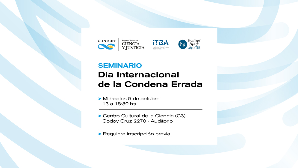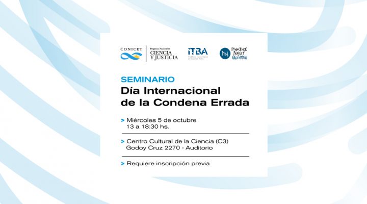 El Consejo Nacional de Investigaciones Científicas y Técnicas (CONICET), a través del Programa Nacional de Ciencia y Justicia, junto al Instituto Tecnológico de Buenos Aires (ITBA) y la Fundación Proyecto Inocencia invitan a participar del seminario propuesto en el marco del Día Internacional de la Condena Errada que se realizará el próximo miércoles 5 de octubre de 13 a 18 hs. en el Auditorio del Centro Cultural de la Ciencia (C3) -Godoy Cruz 2270 Ciudad de Buenos Aires-.